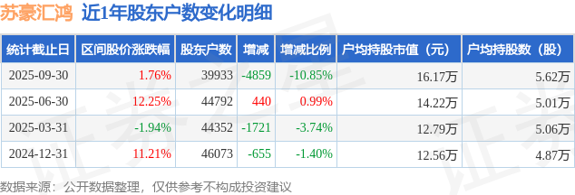 从股价来看,2025年6月30日至2025年9月30日,苏豪汇鸿区间涨幅为1.76%,在此期间股东户数减少4859.0户,减幅为10.85%。