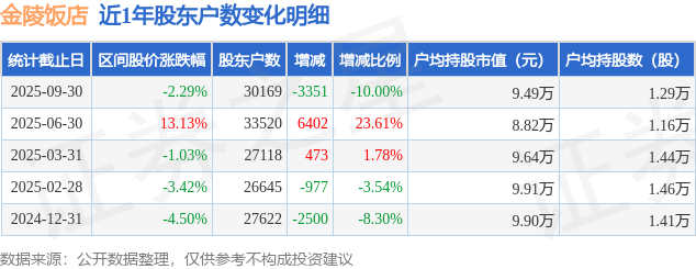 从股价来看,2025年6月30日至2025年9月30日,金陵饭店区间跌幅为2.29%,在此期间股东户数减少3351.0户,减幅为10.0%。