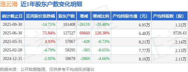 从股价来看,2025年6月30日至2025年9月30日,连云港区间跌幅为14.71%,在此期间股东户数减少2.61万户,减幅为20.48%。