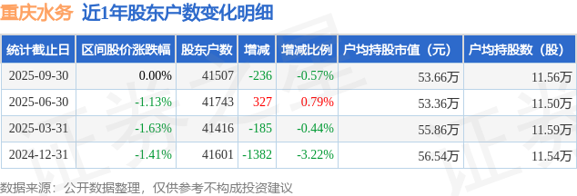 从股价来看,2025年6月30日至2025年9月30日,重庆水务区间跌幅为0.0%,在此期间股东户数减少236.0户,减幅为0.57%。