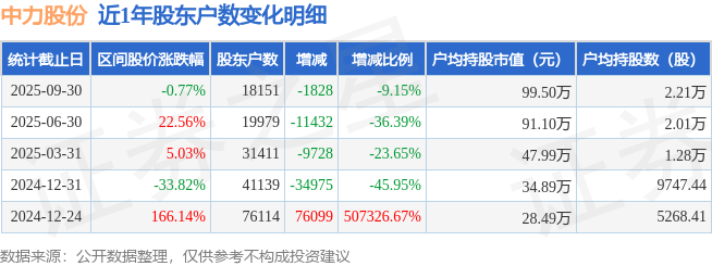 从股价来看,2025年6月30日至2025年9月30日,中力股份区间跌幅为0.77%,在此期间股东户数减少1828.0户,减幅为9.15%。