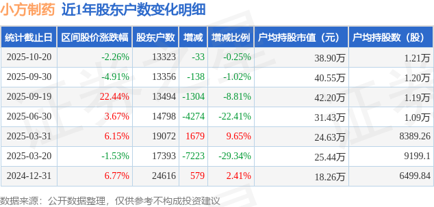 从股价来看,2025年9月30日至2025年10月20日,小方制药区间跌幅为2.26%,在此期间股东户数减少33.0户,减幅为0.25%。