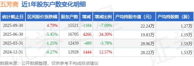 从股价来看,2025年6月30日至2025年9月30日,五芳斋区间涨幅为4.79%,在此期间股东户数减少1184.0户,减幅为7.09%。