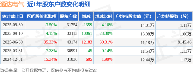 从股价来看,2025年9月10日至2025年9月30日,通达电气区间跌幅为3.5%,在此期间股东户数减少1359.0户,减幅为4.1%。