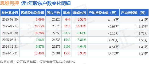 从股价来看,2025年8月14日至2025年9月30日,思维列控区间涨幅为6.09%,在此期间股东户数增加644.0户,增幅为2.52%。