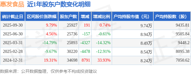 从股价来看,2025年6月30日至2025年9月30日,惠发食品区间涨幅为9.79%,在此期间股东户数增加191.0户,增幅为0.74%。