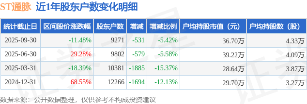 从股价来看,2025年6月30日至2025年9月30日,ST通脉区间跌幅为11.48%,在此期间股东户数减少531.0户,减幅为5.42%。