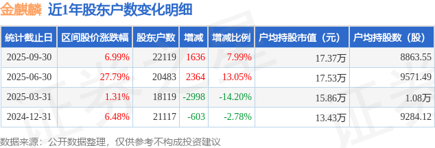 从股价来看,2025年6月30日至2025年9月30日,金麒麟区间涨幅为6.99%,在此期间股东户数增加1636.0户,增幅为7.99%。