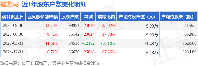 从股价来看,2025年6月30日至2025年9月30日,福龙马区间涨幅为33.78%,在此期间股东户数增加2.48万户,增幅为33.02%。