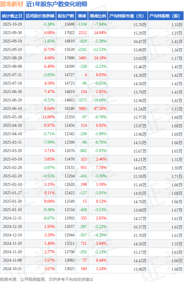 从股价来看,2025年9月30日至2025年10月20日,丽岛新材区间跌幅为5.38%,在此期间股东户数减少1334.0户,减幅为7.84%。
