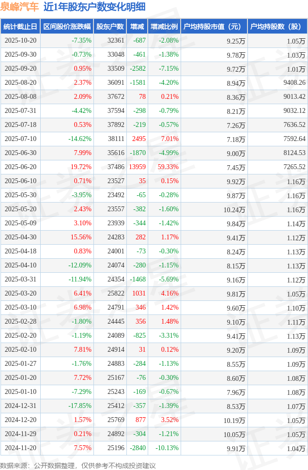 证券之星消息,近日泉峰汽车披露,截至2025年10月20日公司股东户数为3.24万户,较9月30日减少687.0户,减幅为2.08%。户均持股数量由上期的1.03万股增加至1.05万股,户均持股市值为9.25万元。