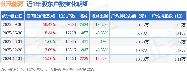 从股价来看,2025年6月30日至2025年9月30日,世茂能源区间涨幅为58.47%,在此期间股东户数减少2424.0户,减幅为19.82%。