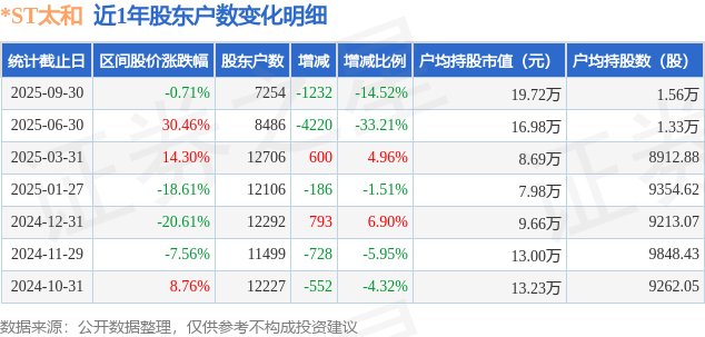 从股价来看,2025年6月30日至2025年9月30日,*ST太和区间跌幅为0.71%,在此期间股东户数减少1232.0户,减幅为14.52%。