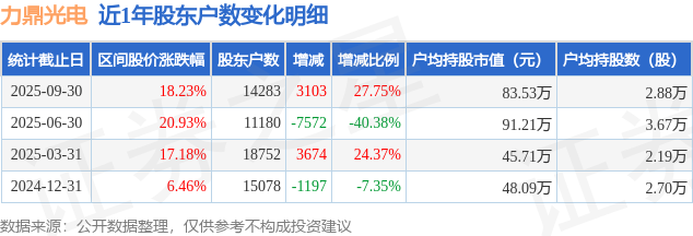 从股价来看,2025年6月30日至2025年9月30日,力鼎光电区间涨幅为18.23%,在此期间股东户数增加3103.0户,增幅为27.75%。