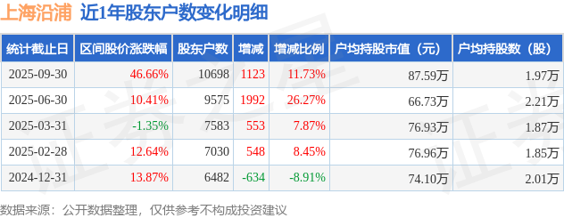 从股价来看,2025年6月30日至2025年9月30日,上海沿浦区间涨幅为46.66%,在此期间股东户数增加1123.0户,增幅为11.73%。