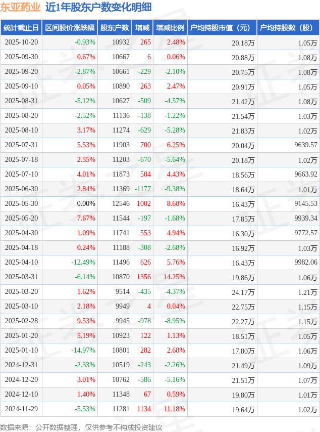 从股价来看,2025年9月30日至2025年10月20日,东亚药业区间跌幅为0.93%,在此期间股东户数增加265.0户,增幅为2.48%。