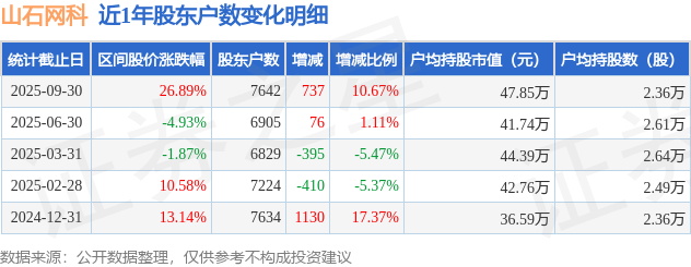 从股价来看,2025年6月30日至2025年9月30日,山石网科区间涨幅为26.89%,在此期间股东户数增加737.0户,增幅为10.67%。