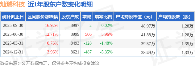 从股价来看,2025年6月30日至2025年9月30日,灿瑞科技区间涨幅为16.92%,在此期间股东户数减少2.0户,减幅为0.02%。