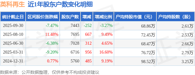 从股价来看,2025年8月10日至2025年9月30日,英科再生区间跌幅为7.47%,在此期间股东户数减少252.0户,减幅为3.27%。