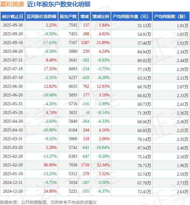 证券之星消息,近日嘉和美康披露,截至2025年9月30日公司股东户数为7592.0户,较9月20日增加137.0户,增幅为1.84%。户均持股数量由上期的1.85万股减少至1.81万股,户均持股市值为55.13万元。