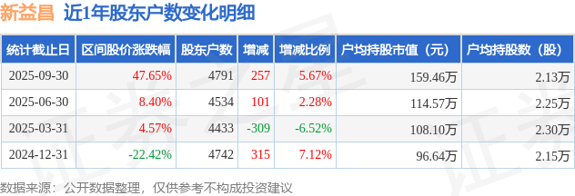 证券之星消息,近日新益昌披露,截至2025年9月30日公司股东户数为4791.0户,较6月30日增加257.0户,增幅为5.67%。户均持股数量由上期的2.25万股减少至2.13万股,户均持股市值为159.46万元。