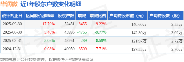 从股价来看,2025年6月30日至2025年9月30日,华润微区间涨幅为17.79%,在此期间股东户数增加8455.0户,增幅为19.22%。