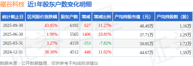 从股价来看,2025年6月30日至2025年9月30日,磁谷科技区间涨幅为43.05%,在此期间股东户数增加627.0户,增幅为11.27%。