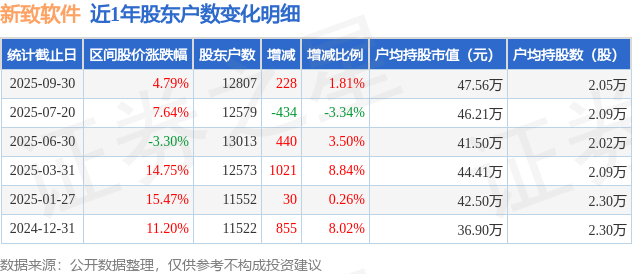 从股价来看,2025年7月20日至2025年9月30日,新致软件区间涨幅为4.79%,在此期间股东户数增加228.0户,增幅为1.81%。