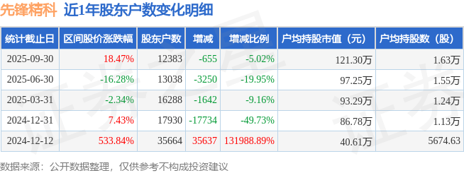 从股价来看,2025年6月30日至2025年9月30日,先锋精科区间涨幅为18.47%,在此期间股东户数减少655.0户,减幅为5.02%。
