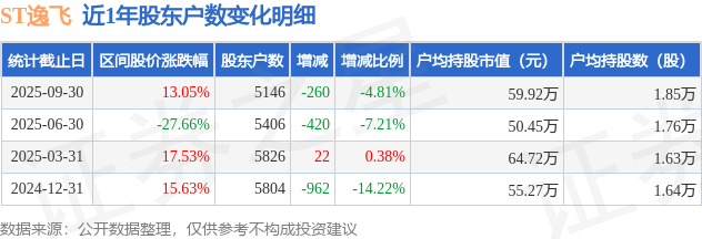 从股价来看,2025年6月30日至2025年9月30日,ST逸飞区间涨幅为13.05%,在此期间股东户数减少260.0户,减幅为4.81%。