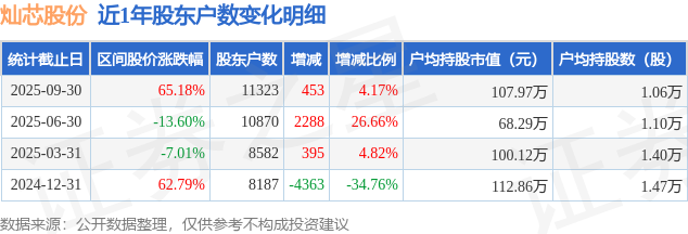 从股价来看,2025年6月30日至2025年9月30日,灿芯股份区间涨幅为65.18%,在此期间股东户数增加453.0户,增幅为4.17%。