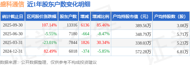 从股价来看,2025年6月30日至2025年9月30日,盛科通信区间涨幅为107.14%,在此期间股东户数增加6136.0户,增幅为85.46%。