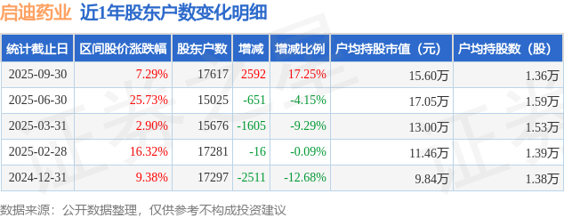 从股价来看,2025年6月30日至2025年9月30日,启迪药业区间涨幅为7.29%,在此期间股东户数增加2592.0户,增幅为17.25%。