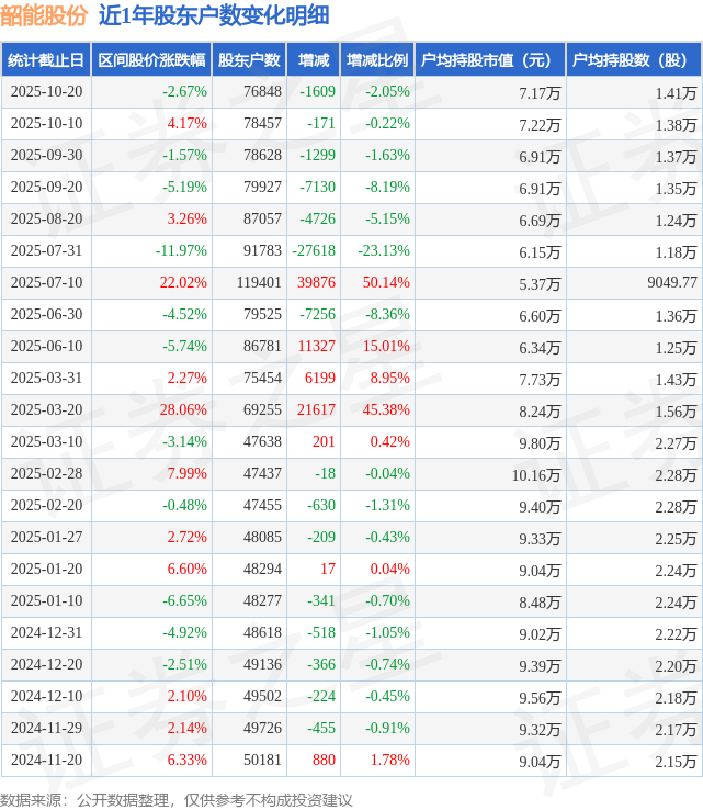 从股价来看,2025年10月10日至2025年10月20日,韶能股份区间跌幅为2.67%,在此期间股东户数减少1609.0户,减幅为2.05%。