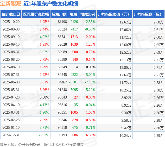 从股价来看,2025年9月30日至2025年10月20日,宝新能源区间涨幅为1.95%,在此期间股东户数减少2126.0户,减幅为2.55%。