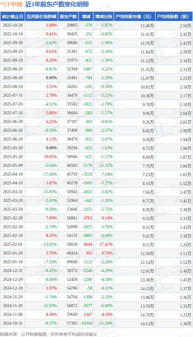 从股价来看,2025年10月10日至2025年10月20日,*ST中地区间涨幅为2.68%,在此期间股东户数减少570.0户,减幅为1.87%。