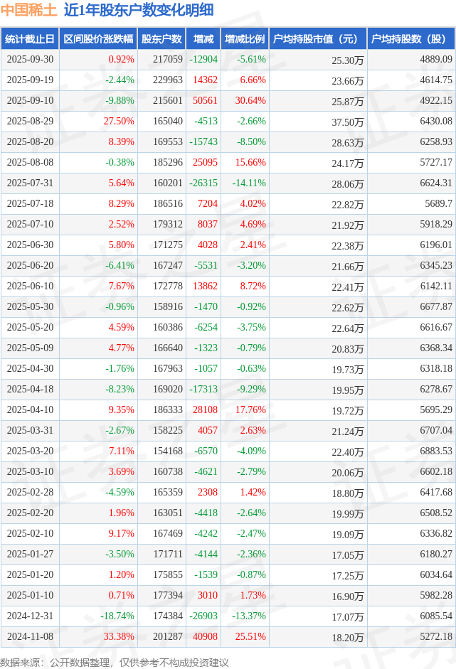 从股价来看,2025年9月19日至2025年9月30日,中国稀土区间涨幅为0.92%,在此期间股东户数减少1.29万户,减幅为5.61%。