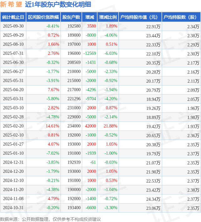 从股价来看,2025年9月29日至2025年9月30日,新 希 望区间跌幅为0.41%,在此期间股东户数增加3580.0户,增幅为1.89%。