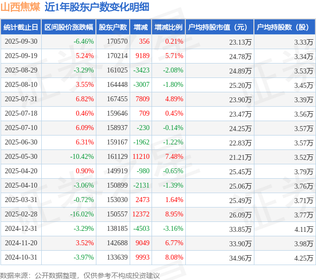 从股价来看,2025年9月19日至2025年9月30日,山西焦煤区间跌幅为6.46%,在此期间股东户数增加356.0户,增幅为0.21%。