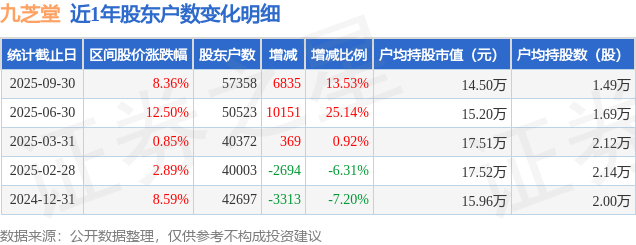 证券之星消息,近日九芝堂披露,截至2025年9月30日公司股东户数为5.74万户,较6月30日增加6835.0户,增幅为13.53%。户均持股数量由上期的1.69万股减少至1.49万股,户均持股市值为14.5万元。