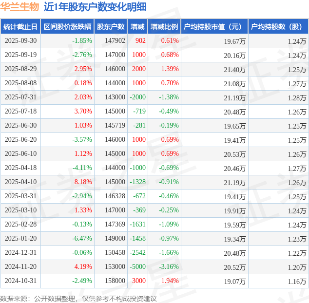 从股价来看,2025年9月19日至2025年9月30日,华兰生物区间跌幅为1.85%,在此期间股东户数增加902.0户,增幅为0.61%。