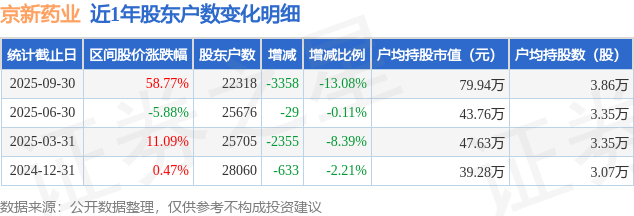 从股价来看,2025年6月30日至2025年9月30日,京新药业区间涨幅为58.77%,在此期间股东户数减少3358.0户,减幅为13.08%。