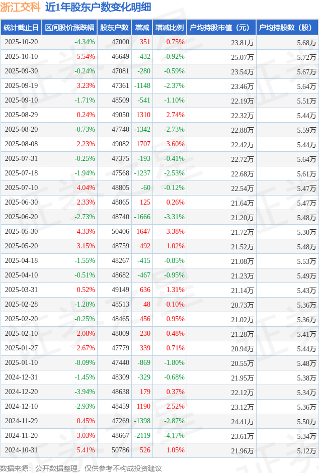 从股价来看,2025年10月10日至2025年10月20日,浙江交科区间跌幅为4.34%,在此期间股东户数增加351.0户,增幅为0.75%。