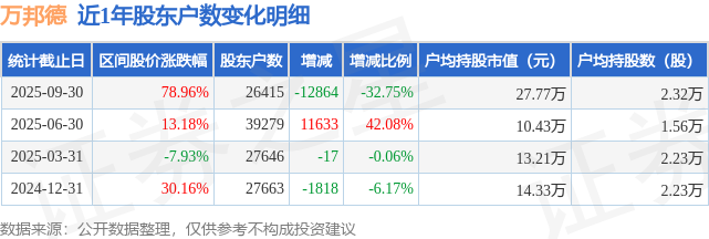 从股价来看,2025年6月30日至2025年9月30日,万邦德区间涨幅为78.96%,在此期间股东户数减少1.29万户,减幅为32.75%。