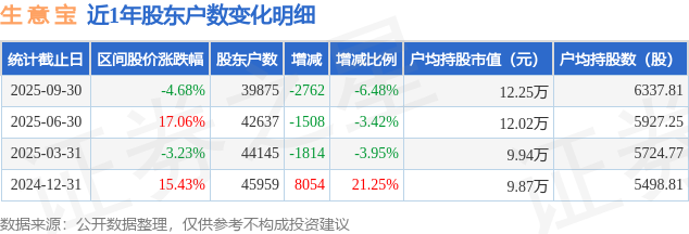 从股价来看,2025年6月30日至2025年9月30日,生 意 宝区间跌幅为4.68%,在此期间股东户数减少2762.0户,减幅为6.48%。