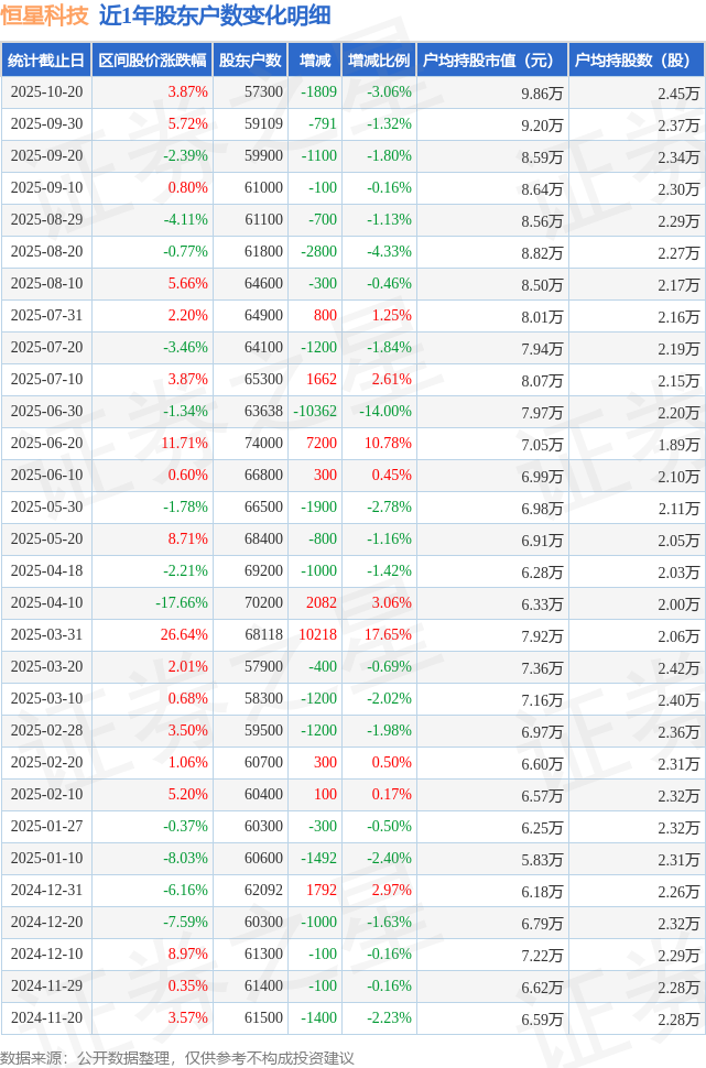 从股价来看,2025年9月30日至2025年10月20日,恒星科技区间涨幅为3.87%,在此期间股东户数减少1809.0户,减幅为3.06%。