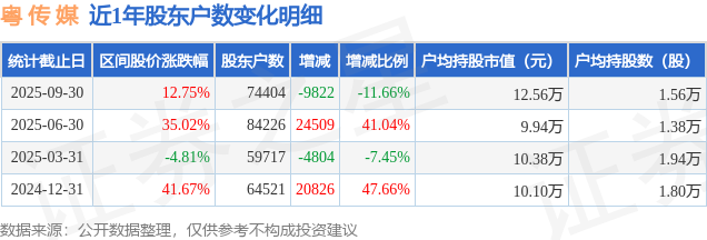 从股价来看,2025年6月30日至2025年9月30日,粤 传 媒区间涨幅为12.75%,在此期间股东户数减少9822.0户,减幅为11.66%。
