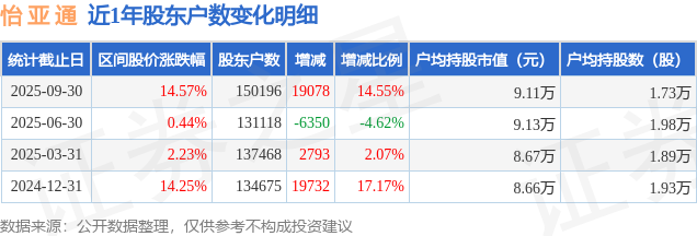 证券之星消息,近日怡 亚 通披露,截至2025年9月30日公司股东户数为15.02万户,较6月30日增加1.91万户,增幅为14.55%。户均持股数量由上期的1.98万股减少至1.73万股,户均持股市值为9.11万元。