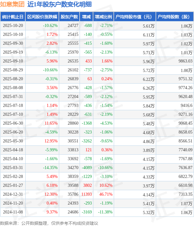 从股价来看,2025年10月10日至2025年10月20日,如意集团区间跌幅为10.62%,在此期间股东户数减少688.0户,减幅为2.71%。