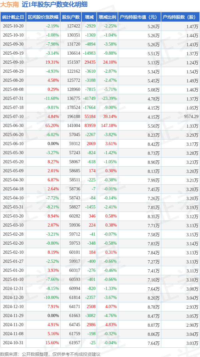 从股价来看,2025年10月10日至2025年10月20日,大东南区间跌幅为2.19%,在此期间股东户数减少2929.0户,减幅为2.25%。